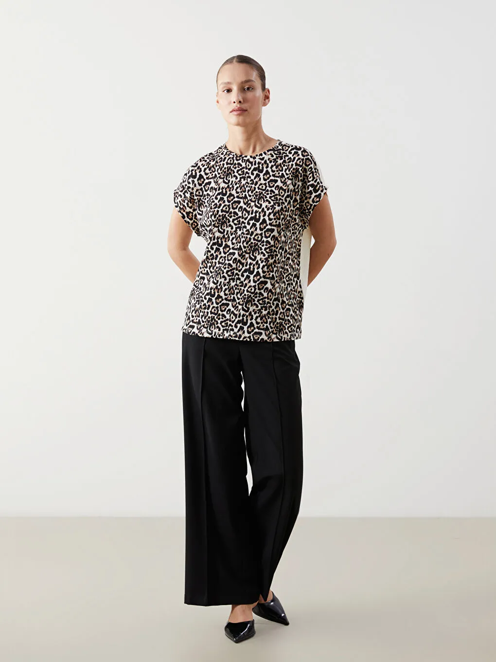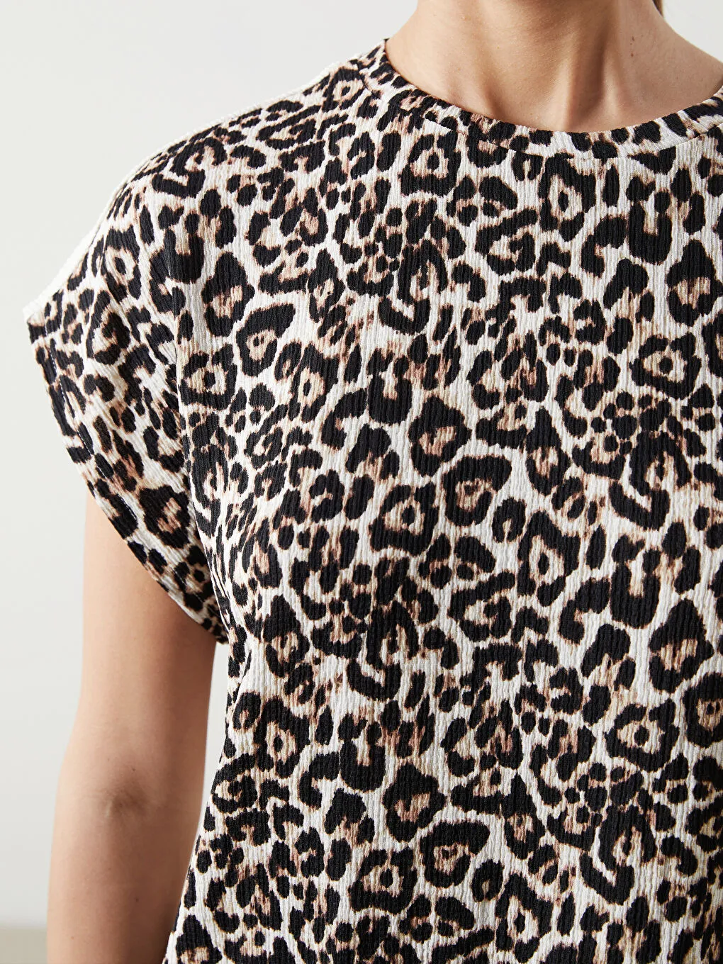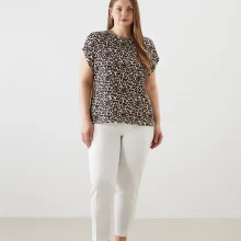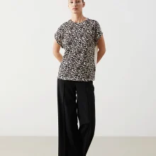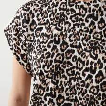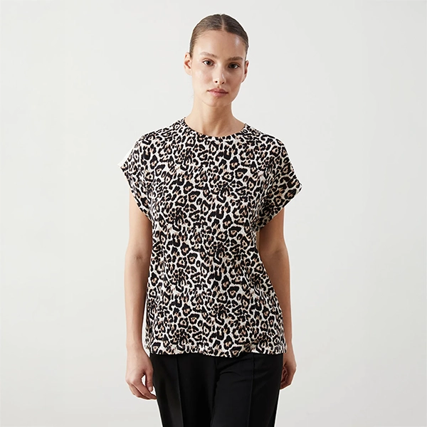 تیشرت زنانه طرح پلنگی با یقه گرد و آستین کوتاه که از پارچه راشل دوخته شده و فرم آزاد دارد.