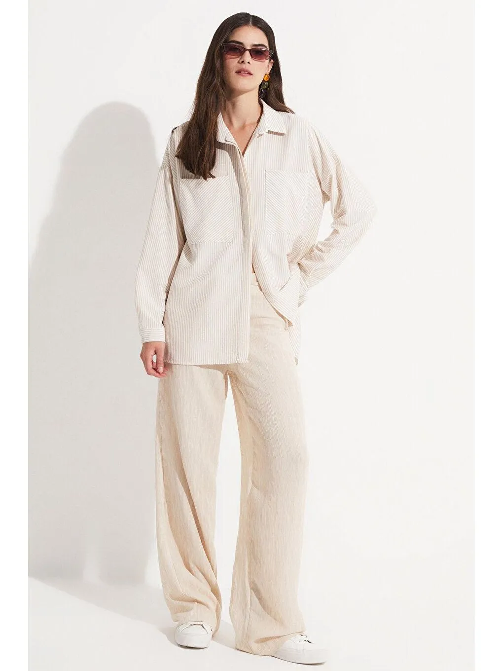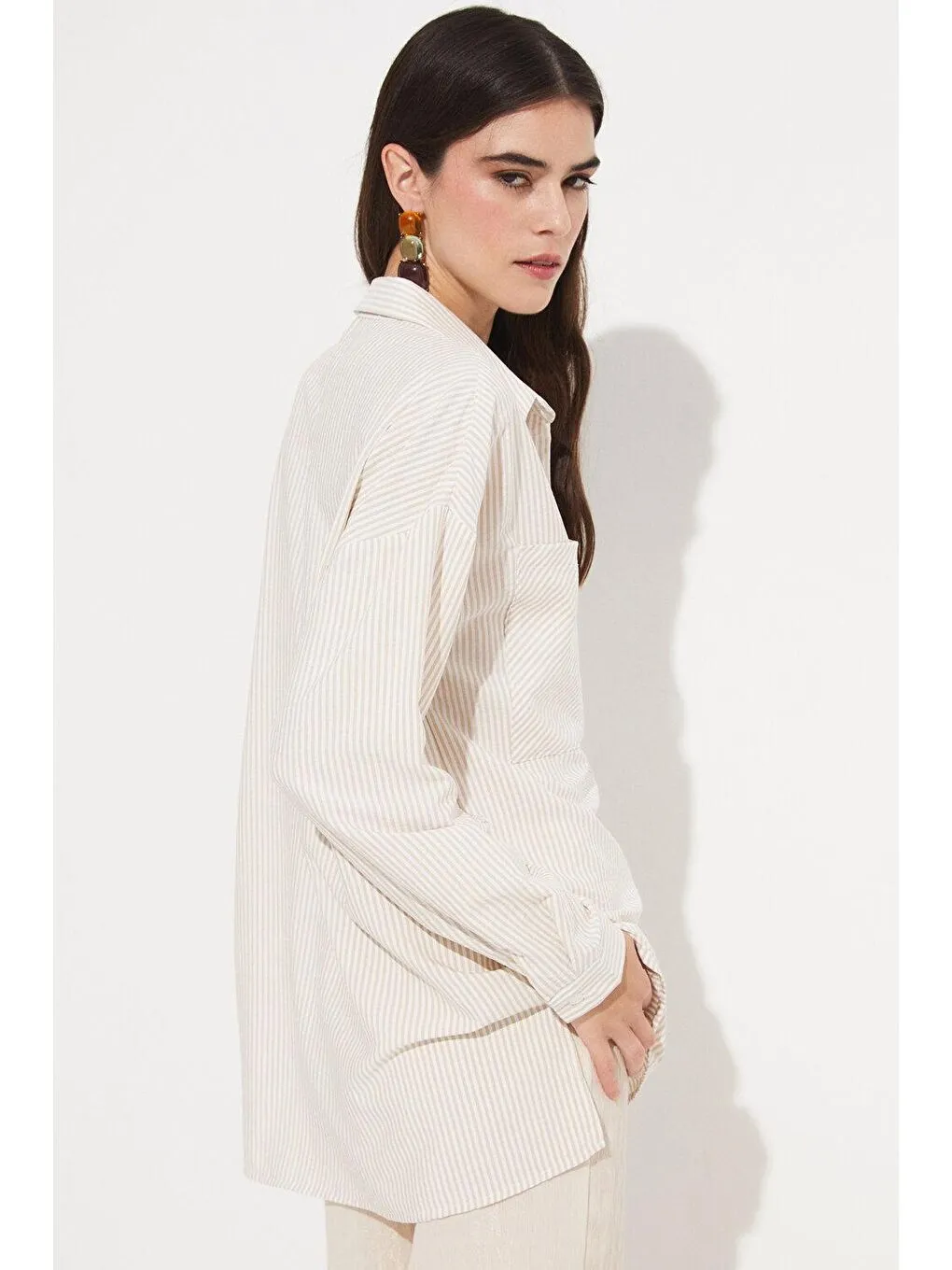 پیراهن زنانه راهراه بژ June | یقه کلاسیک و جیبدار | June Bej Kadın Cep Detaylı Çizgili Dokuma Gömlek