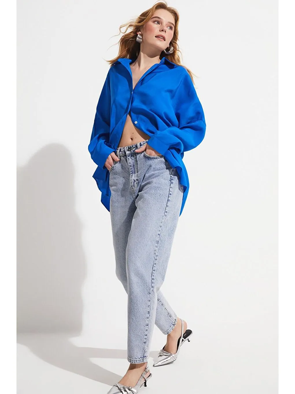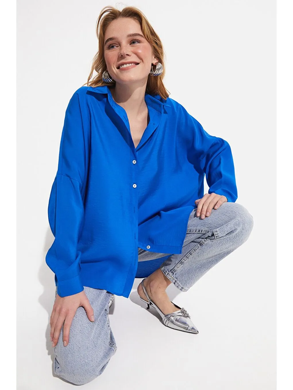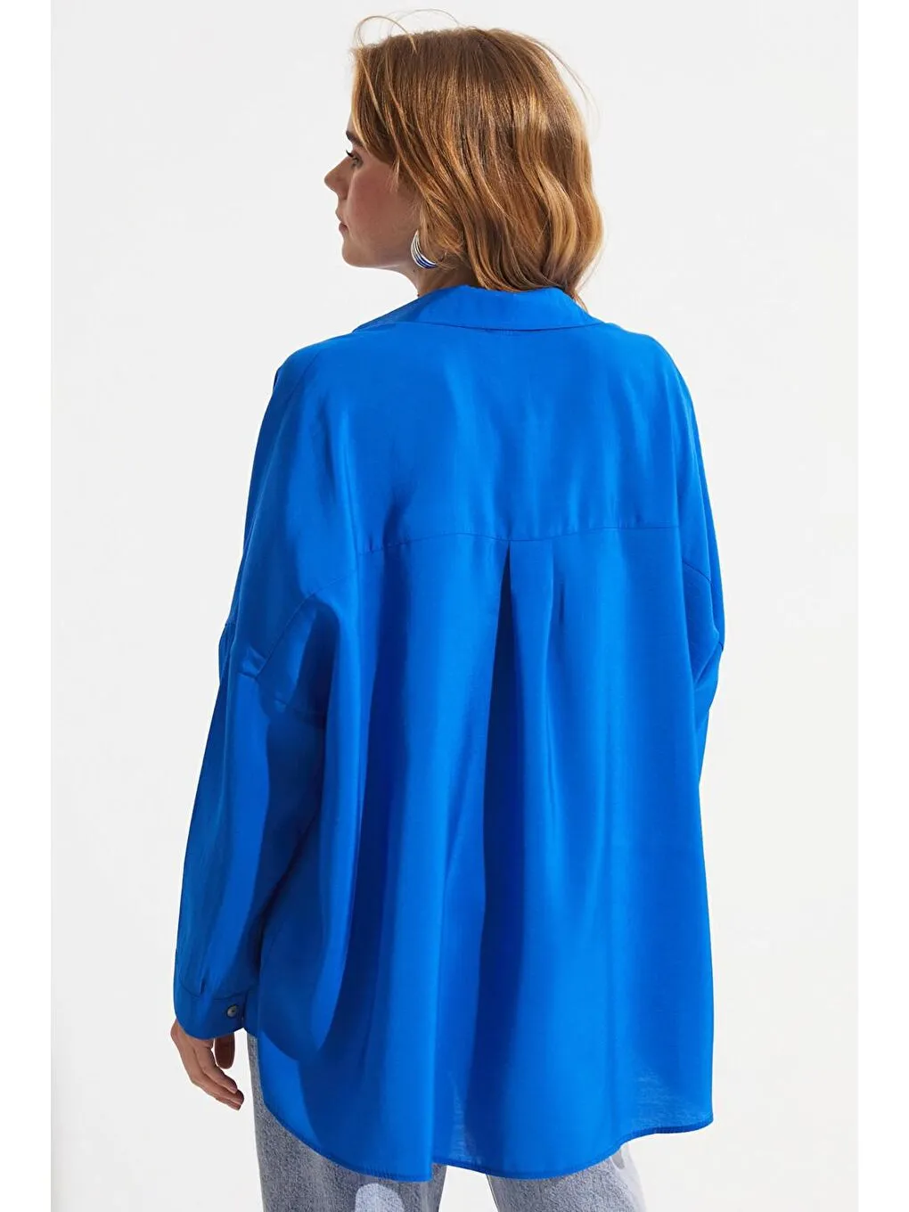 شومیز زنانه اورسایز آبی June مودال ترکیبی | June Mavi Kadın Boyfriend/geniş Kalıp Modal Karışımlı Dokuma Gömlek